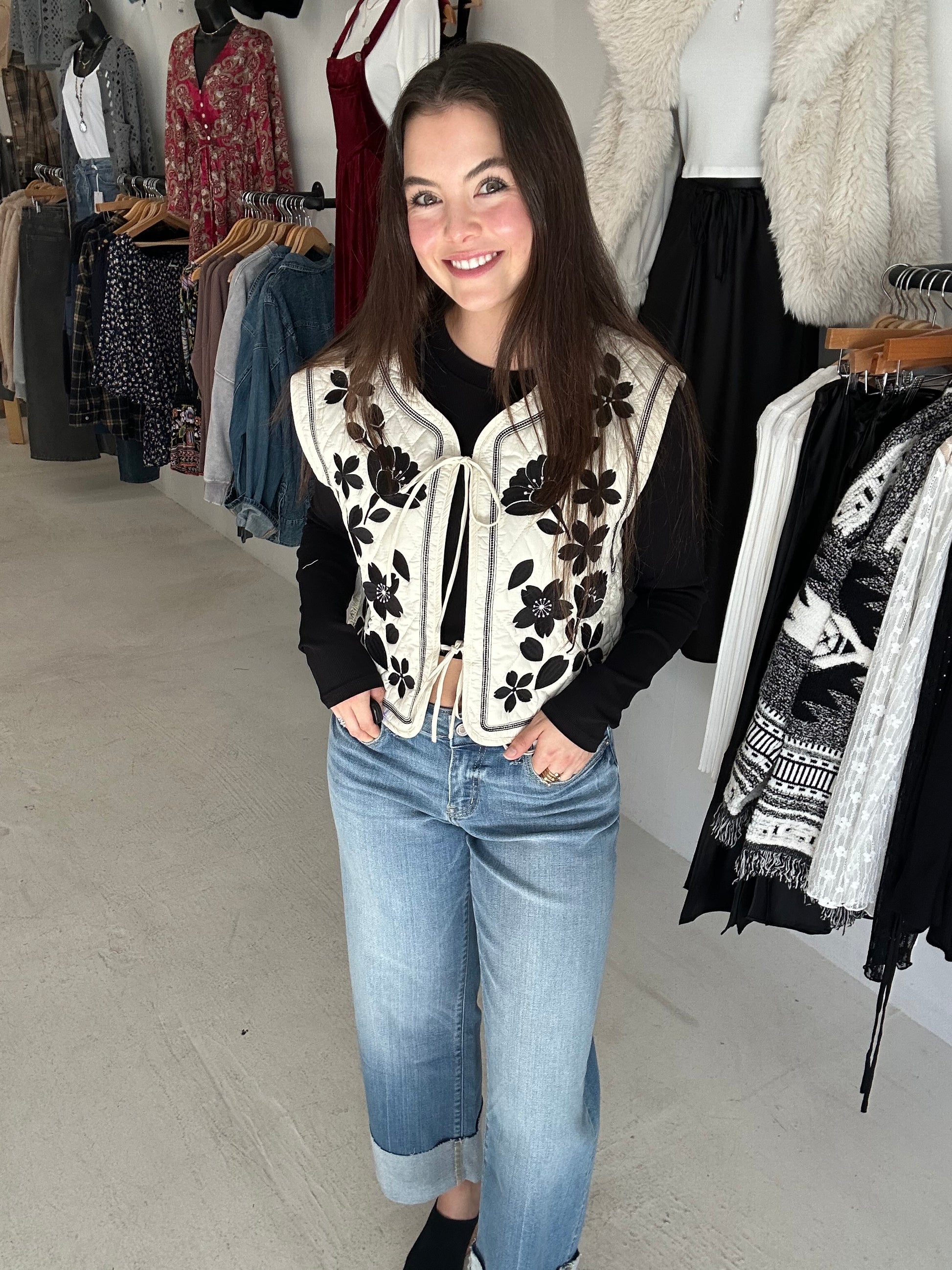 This expertly tailored cream vest features intricate black floral embroidery that adds visual interest and dimension. Constructed from lightweight fabric, it's engineered for comfort in warm weather and layering versatility. The front tie closure allows you to adjust the fit precisely to your preference, creating a flattering silhouette that works with virtually any outfit. The understated color palette and detailed embroidery make this piece a sophisticated staple that elevates both casual and polished looks with ease.