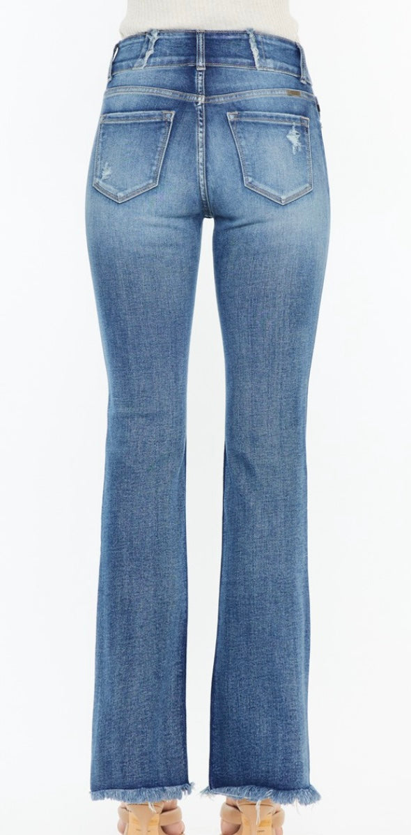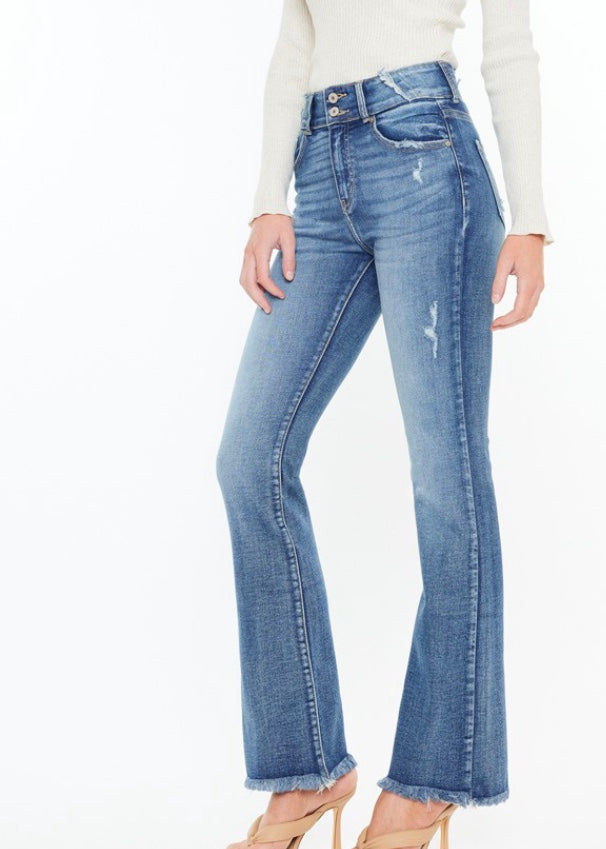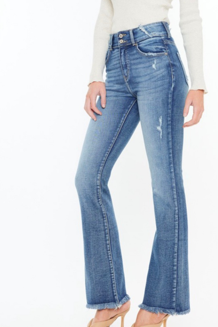 These bootcut jeans in medium wash are versatile and stylish with a comfortable stretch and trendy frayed hem. The perfect go to jeans.