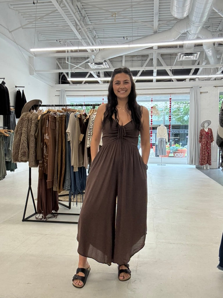 The Madison Jumper combines effortless style with practical comfort. This chocolate-hued piece features a scrunched tie top that creates a flattering silhouette, paired with a flowy design that moves beautifully with you. The smocked back adds subtle texture and visual interest, while functional pockets keep your essentials within reach. Perfect for layering or wearing solo, this versatile jumper transitions seamlessly from casual outings to relaxed gatherings. Comes in multiple colors and prints
