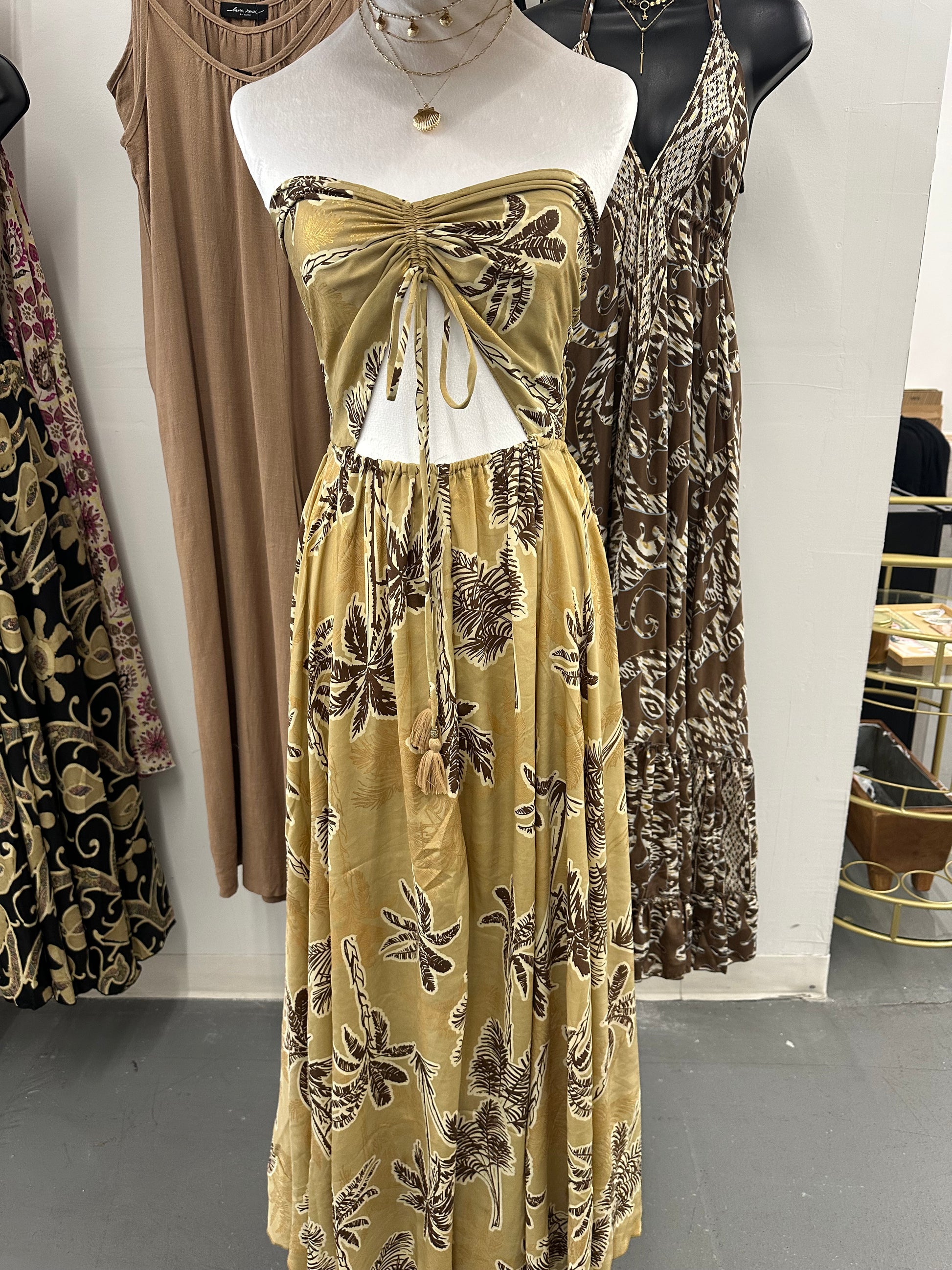The Island dress features a strapless design with a stylish scrunch tie detail and a flattering cutout, enhancing its feminine appeal. Crafted with a stretch waist and back, it ensures a comfortable, flexible fit for various body shapes. Adorned with a vibrant floral print, this one-size dress combines elegance and ease, perfect for warm-weather occasions. One size
