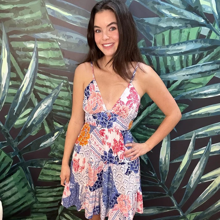 Add a touch of bohemian charm to your wardrobe with our April flowers dress. This short dress features a tie back for a unique and adorable look perfect for any occasion, such as Easter, brunch, or vacation.
